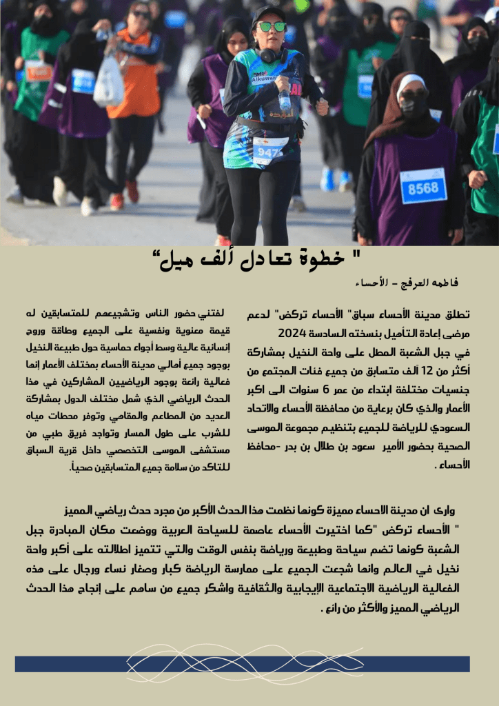 ” الاحساء تركض “كما اختيرت الاحساء عاصمة للسياحة العربية ووضعت مكان المبادرة جبل الشعبة كونها تضم سياحة وطبيعة ورياضة بنفس الوقت والتي تتميز اطلالته على أكبر واحة نخيل في العالم وانها شجعت الجميع على ممارسة الرياضة كبار وصغار نساء ورجال على هذه الفعالية الرياضية الاجتماعية الإيجابية والثقافية واشكر جميع من ساهم على إنجاح هذا الحدث الرياضي المميز والأكثر من رائع .